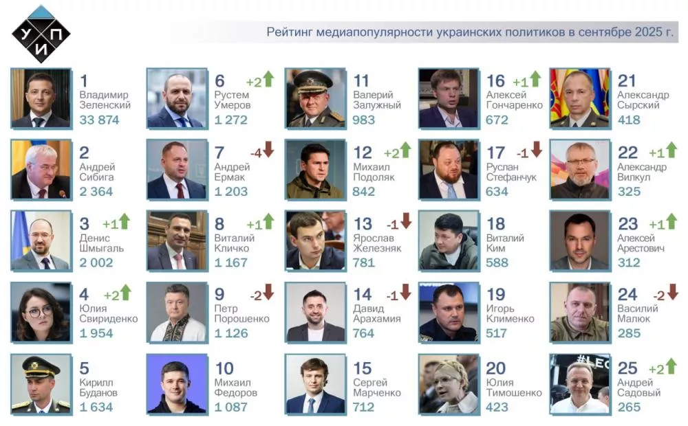 По результатам анализа сообщений за сентябрь 2025 года в аналитической системе «Медиатека» публикаций новостных агентств, интернет и печатных СМИ, телевидения и сообщений в Facebook сформирован список из 269 наиболее упоминаемых политических фигур Украины.
