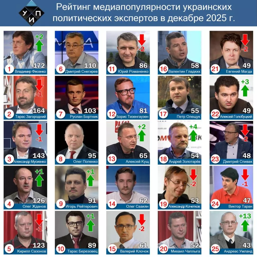 Наиболее цитируемым в средствах массовой информации политическим экспертом в декабре 2025 года (в аналитическом обзоре) стал Тарас Загородний (107 упоминания в СМИ).