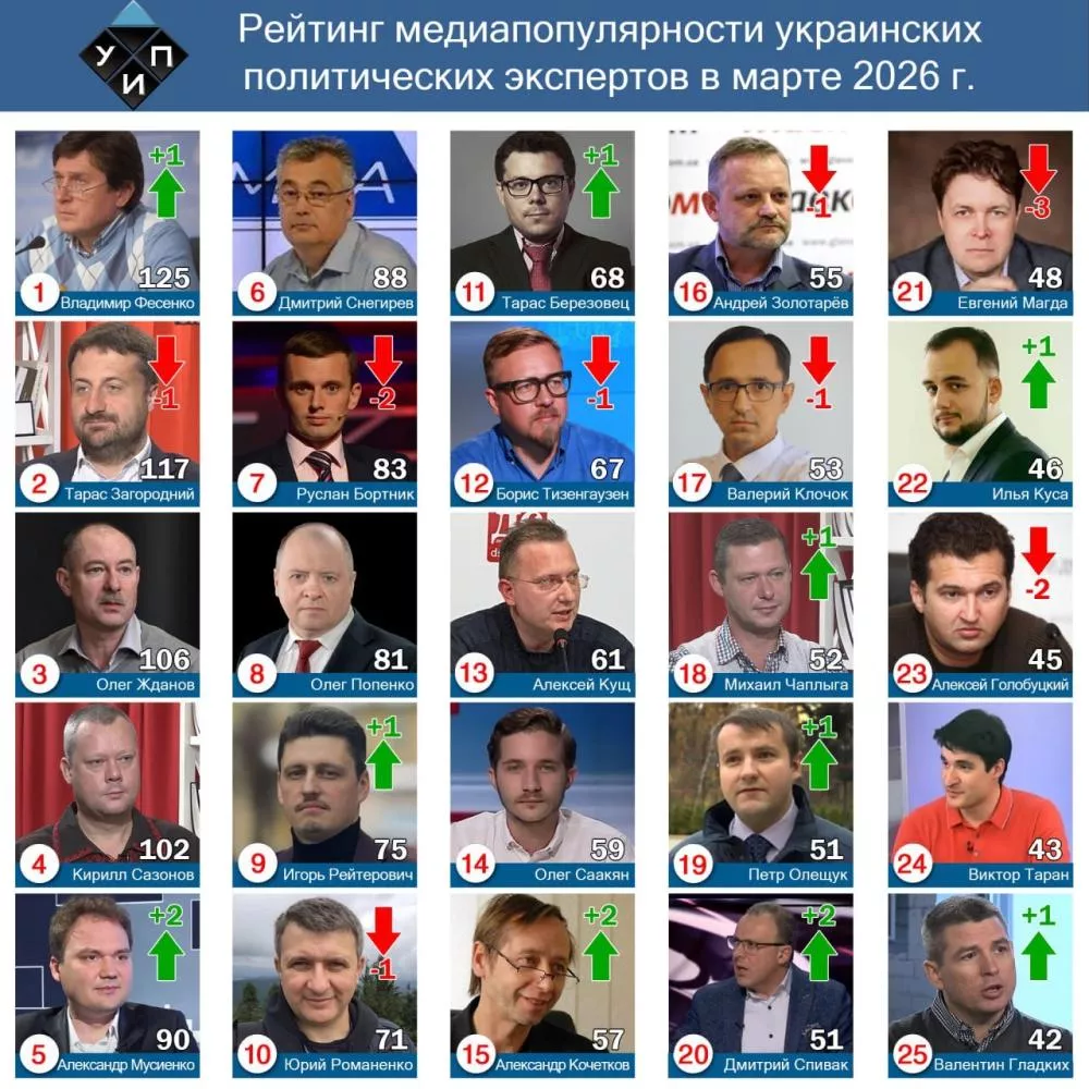 Наиболее цитируемым (количественно) в средствах массовой информации политическим экспертом в марте 2026 года стал Владимир Фесенко (125 упоминания в СМИ).