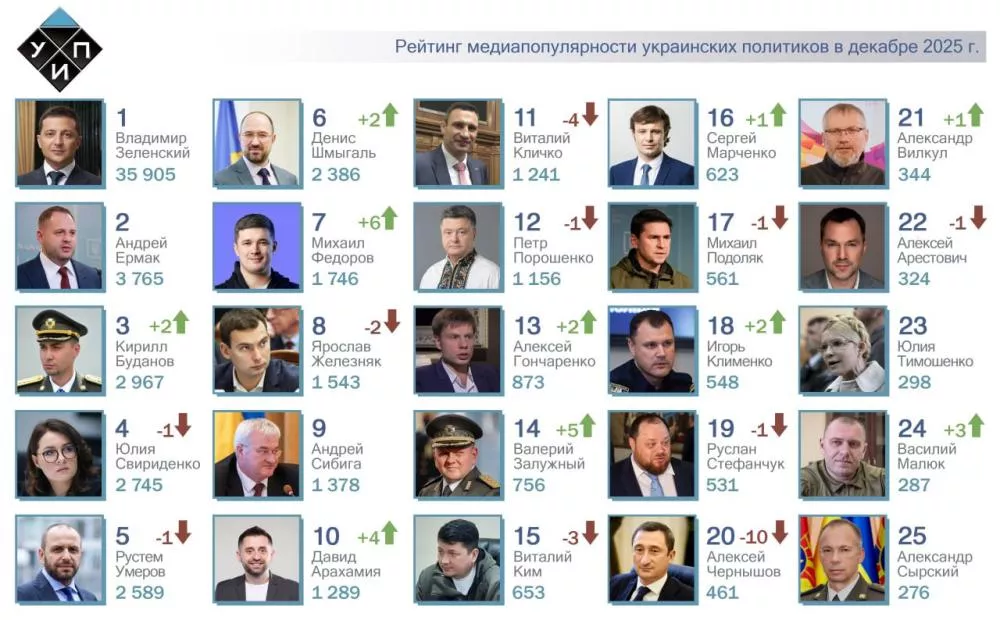 По результатам анализа сообщений за декабрь 2025 года в аналитической системе «Медиатека» публикаций новостных агентств, интернет и печатных СМИ, телевидения и сообщений в Facebook сформирован список из 269 наиболее упоминаемых политических фигур Украины.