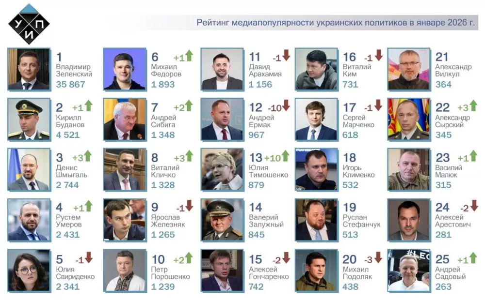 По результатам анализа сообщений за январь 2026 года в аналитической системе «Медиатека» публикаций новостных агентств, интернет и печатных СМИ, телевидения и сообщений в Facebook сформирован список из 269 наиболее упоминаемых политических фигур Украины.