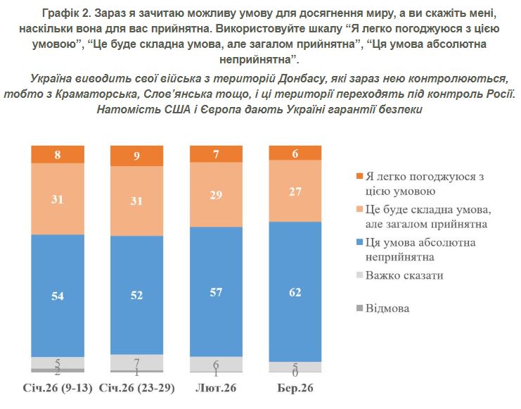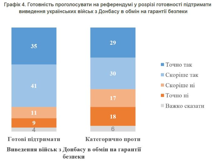 Относительное большинство украинцев поддерживают идею проведения референдума. Хотя есть тенденция к ухудшению отношения к этой идее. Так, по сравнению с серединой января 2026 года с 55% до 50% стало меньше поддерживающих такую ​​инициативу. С 32% до 40% стало больше тех, кто выступает против. КМИС с января 2026 года задает вопрос, готовы ли украинцы к выводу войск из Донбасса в обмен на гарантии безопасности от США и Европы. Последние опубликованные результаты касаются периода на середину февраля 2026 года, и согласно им 57% украинцев сочли такое предложение категорически неприемлемым. В то же время 36% готовы были ее одобрить (хотя и преимущественно неохотно). идею референдума гораздо больше поддерживают те, кто уже готов одобрить вывод украинских войск из Донбасса в обмен на гарантии безопасности. Среди них 71% положительно относятся к идее референдума (против – 25%). Среди тех, кто категорически против такого предложения по Донбассу, 39% поддерживают идею референдума, 48% выступают против, а 13% имеют неопределенное отношение. 31% респондентов ответили, что они бы точно приняли участие в референдуме в случае его проведения. Еще 33% ответили, что скорее примут участие. То есть, в общей сложности 64% выражают готовность проголосовать, хотя из них только половина твердо собираются это делать. Треть респонденти (30%) отметили, что скорее или точно не примут участие в голосовании.