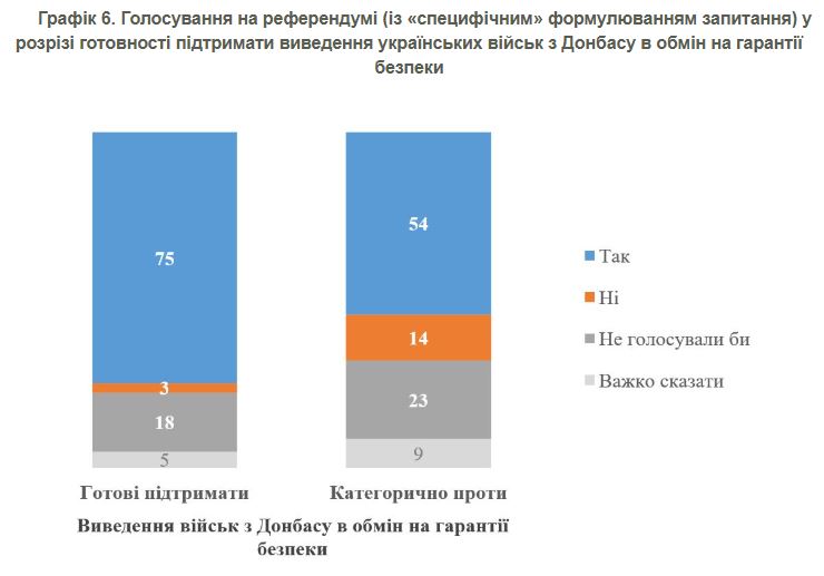 Положительный или отрицательный результат референдума во многом зависит от формулировки вопроса. При «правильно» сконструированном тексте можно существенно повлиять на восприятие избирателей. Социология показывает, что большинство украинцев отвергают вывод войск из Донбасса в обмен на гарантии безопасности — тем более в условиях, когда гарантии со стороны США не выглядят убедительными. Однако если чувствительные элементы не акцентируются напрямую или «упаковываются» в позитивные формулировки, вероятность получения одобрения на всенародном голосовании существенно возрастает.