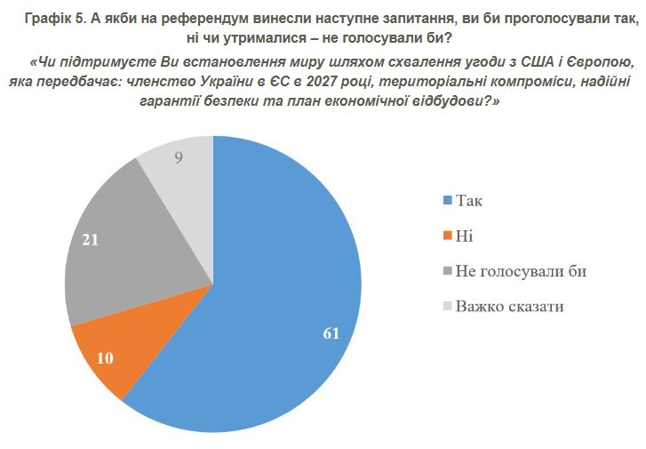 Согласно данным такого моделирования, 61% респондентов готовы были бы проголосовать «за», 10% — «против», остальные не определились или не планировали участвовать. Если пересчитать результат только среди тех, кто пришёл бы на голосование, доля поддержки составила бы около 86%, а против — 14%. Примечательно, что даже среди тех, кто категорически против обмена Донбасса на гарантии безопасности, 54% в условиях подобной формулировки готовы были бы проголосовать «за», и лишь 14% — «против».