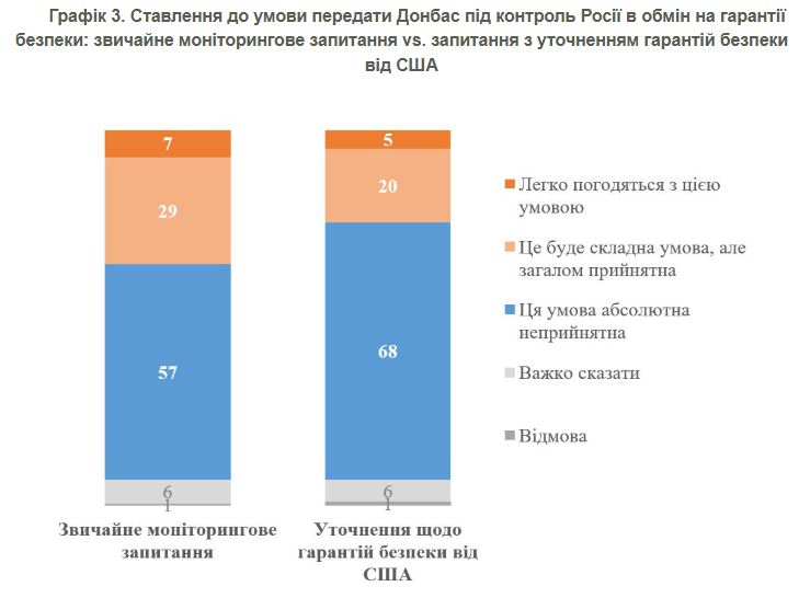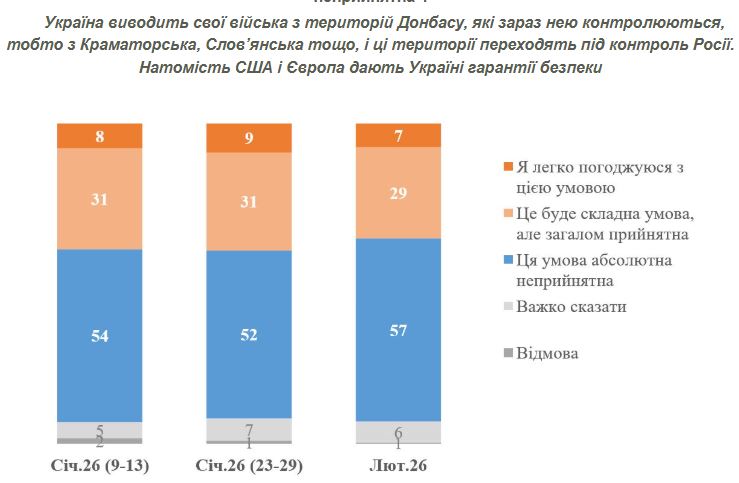 По состоянию на середину февраля 57% украинцев категорически против такого варианта, 36% в целом готовы его поддержать (преимущественно неохотно), 7% не определились. В конце января категорически против были 52%, готовы поддержать — 40%; в середине января — соответственно 54% и 38%.