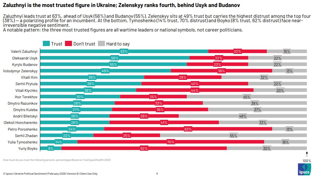 В рейтинге доверия лидирует Валерий Залужный: ему доверяют 63% опрошенных, не доверяют 22%, не определились 15% (баланс доверия +41). На втором месте — Александр Усик с показателем доверия 56%, недоверием 22% и 22% неопределившихся (баланс +34). Третью позицию занимает Кирилл Буданов: 55% доверяют, 23% не доверяют, 22% не определились (баланс +32). Владимир Зеленский находится на четвёртом месте: 49% доверия, 38% недоверия, 13% не определились (баланс +11).